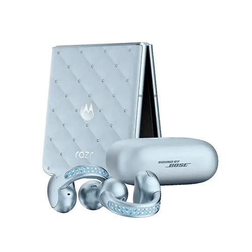 The Brilliant Collection pairs the motorola razr and moto buds loop with crystals by Swarovski®, blending fashion and function in perfect harmony. Both are styled in the luminous PANTONE™ Ice Melt, a shade of crisp clarity and refined calm.